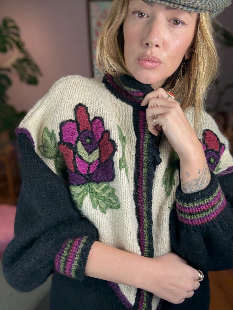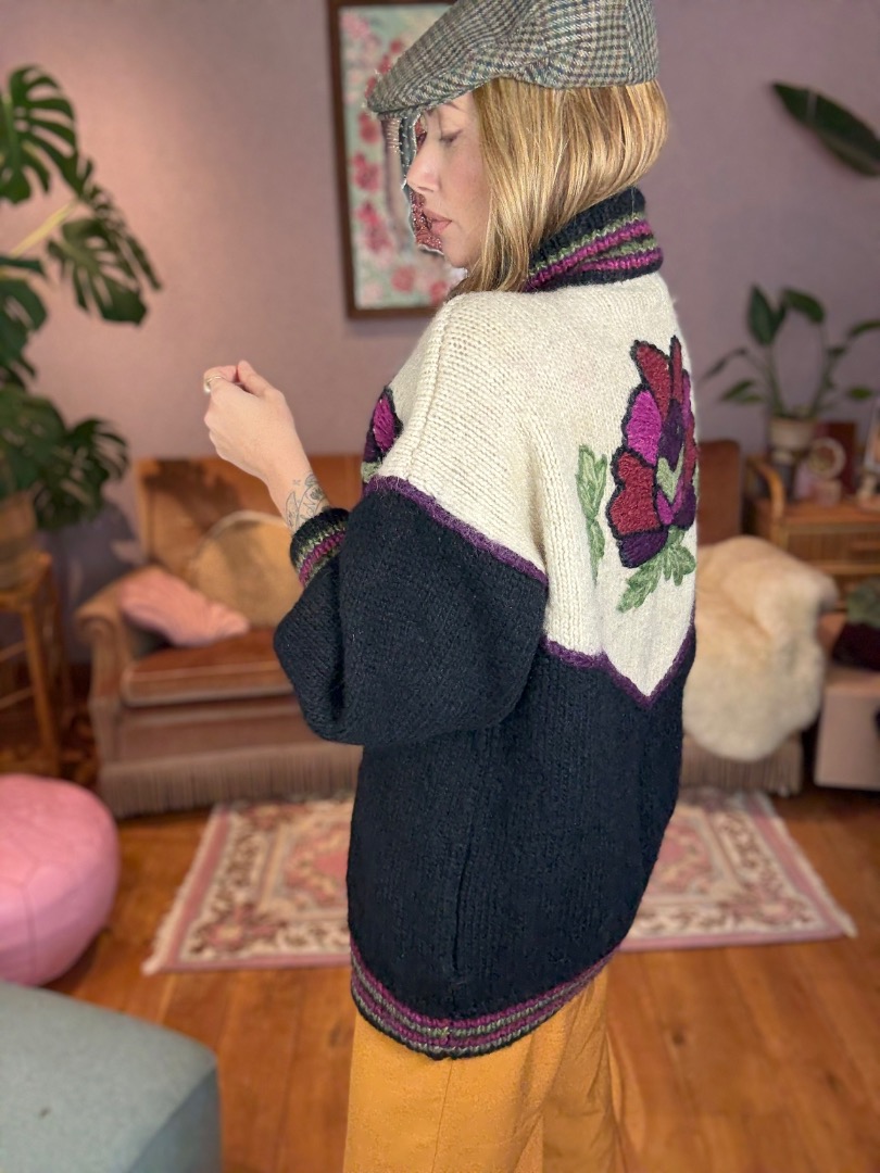 Black Bordeaux Creme Woollen Flower Embroidery Knit