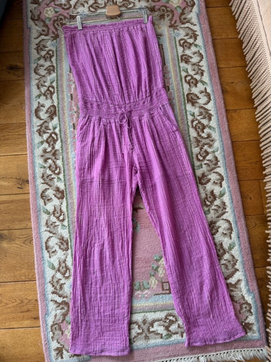 *Jumpsuit is in minor condition, the fabric is aged, but still very comfy for summer. Some holes are fixed by hand. Included in price.