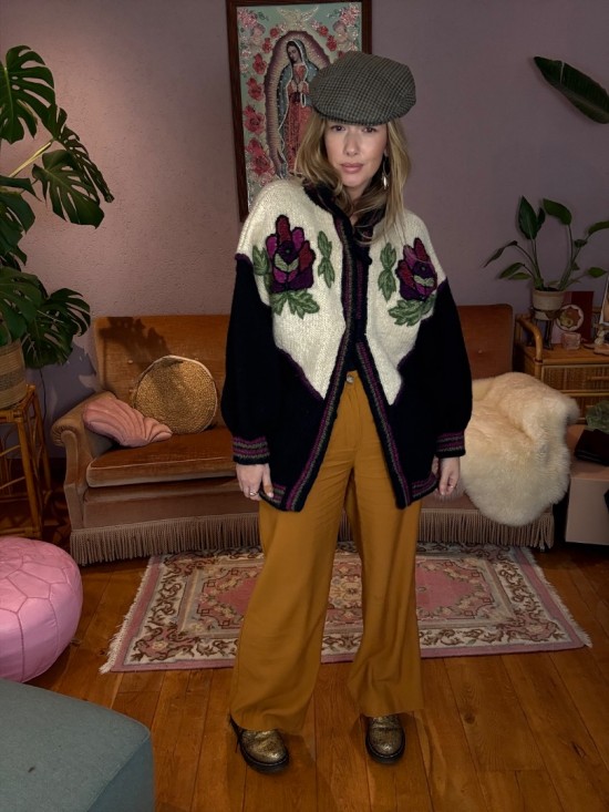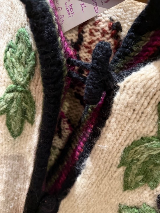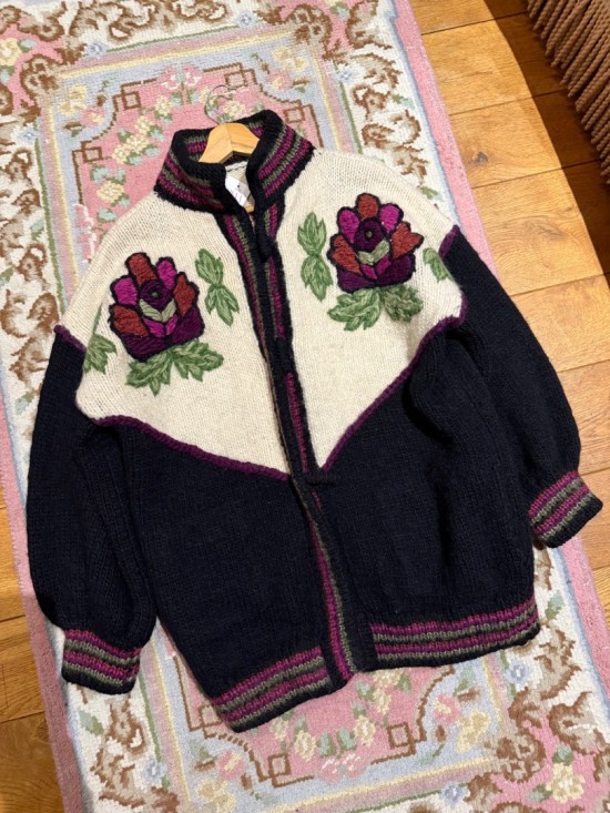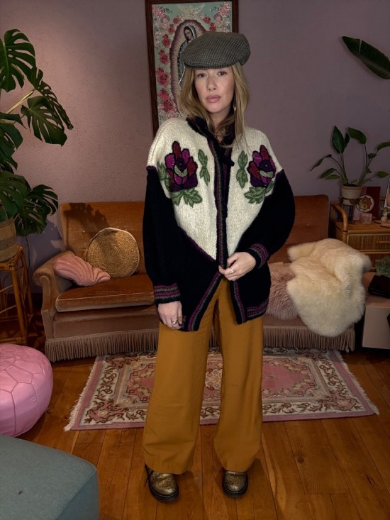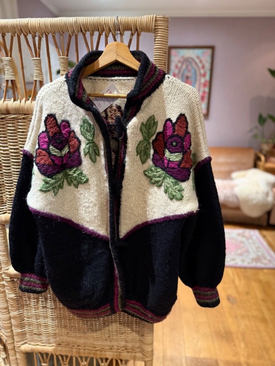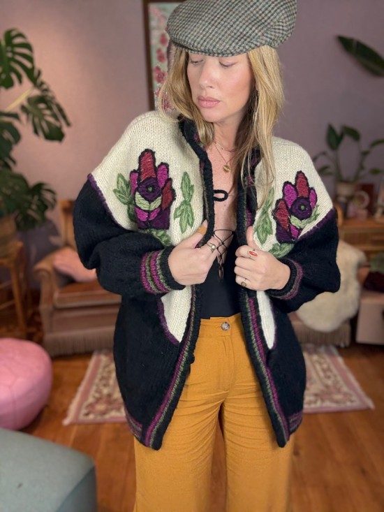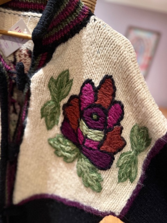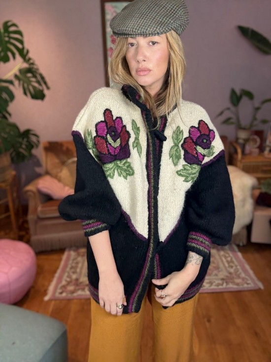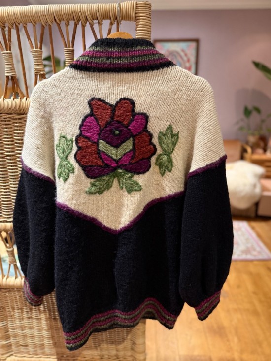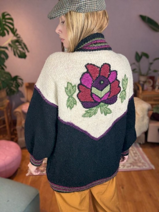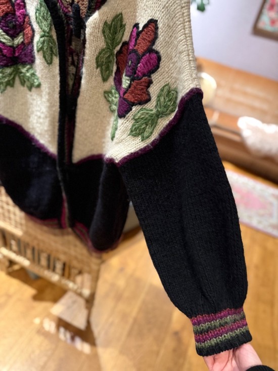 Black Bordeaux Creme Woollen Flower Embroidery Knit
